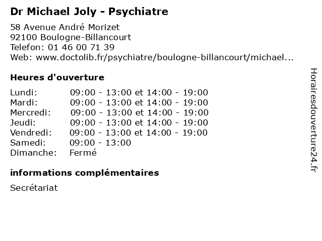 1 Dr Stéphane Hautecouverture - Psychiatre (Distance: 0,96 km) 11 Rue de l'Église, 92100 Boulogne-Billancourt dr, folie, hautecouverture, psychiatre, psychiatrie, psychiatrique, stephane, stéphane 2 Dr. Danon Nathalie - Psychiatre (Distance: 2,25 km) 26 Rue Boileau, 75016 Paris danon, docteur, dr., medecins, nathalie, psychiatre, sante 3 Dr Olivier Gay - Psychiatre - secrétariat (Distance: 2,78 km) 11 rue de la Porte Jaune, 92380 Garches consultation, docteur, dr, gay, med, médecin, médecine, olivier, psychiatre, secrétariat, traitement 4 Dr Jean-Baptiste Mignon - Psychiatre (Distance: 4,32 km) 149bis Rue Blomet, 75015 Paris baptiste, consultation, dr, jean, mentale, mignon, psychiatre, santé 5 Dr Evelyne Taslitzky - Psychiatre (Distance: 4,74 km) 4a Rue Marmontel, 75015 Paris dr, evelyne, ostéo, ostéopathe, ostéopathes, psychiatre, soins, taslitzky 6 Dr Philippe Dumeige - Psychiatre (Distance: 5,36 km) 37 Rue des Volontaires, 75015 Paris dr, dumeige, médecin, médecine, médical, pharmaceutique, philippe, psychiatre, traitement |