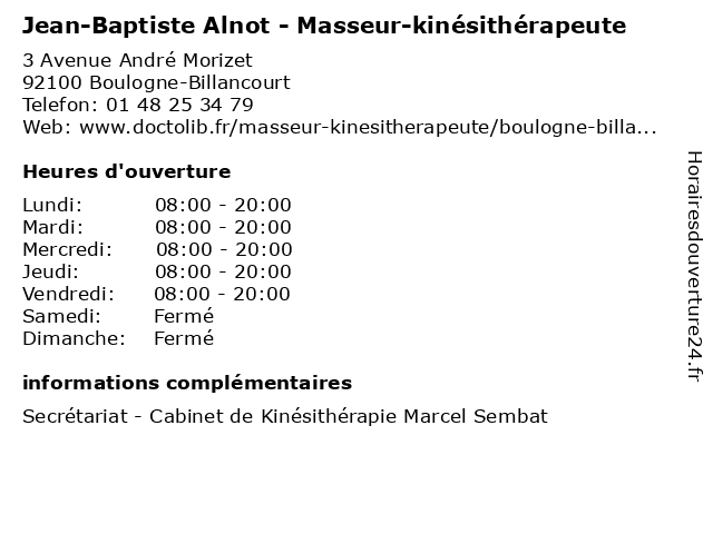 1 Jean-Baptiste Alnot - Masseur-kinésithérapeute (Distance: 1,84 km) 38 Rue Michel Ange, 75016 Paris alnot, baptiste, jean, kiné, kinésithérapeute, masseur, rééducation, soin 2 Baptiste Caparros - Masseur-kinésithérapeute (Distance: 0,00 km) 3 Avenue André Morizet, 92100 Boulogne-Billancourt baptiste, caparros, docteur, kine, kinesitherapeute, kinésithérapeute, masseur 3 Brasserie Jean-Baptiste (Distance: 1,28 km) 1 Rond Point Rhin et Danube, 92100 Boulogne-Billancourt baptiste, brasserie, café, jean, restaurant, restauration 4 Dr Jean-Baptiste Leymarie - Chirurgien orthopédiste et traumatologue (Distance: 1,41 km) 34 Avenue du Général Sarrail, 75016 Paris baptiste, chirurgien, consultation, docteur, dr, et, jean, leymarie, med, médecin, médecine, orthopédiste, traitement, traumatologue 5 Dr Baptiste Magrino - Chirurgien orthopédiste et traumatologue (Distance: 1,41 km) 34 Avenue du Général Sarrail, 75016 Paris baptiste, chirurgien, consultation, docteur, dr, et, magrino, med, médecin, médecine, orthopédiste, traitement, traumatologue 6 Bioclinic - Laboratoire Jean-Baptiste Clément (Distance: 1,53 km) 127 avenue Jean-Baptiste Clément, 92100 Boulogne-Billancourt analyse, baptiste, bioclinic, clément, jean, labaoratoire, laboratoire, médical, sanguin, santé, test |
