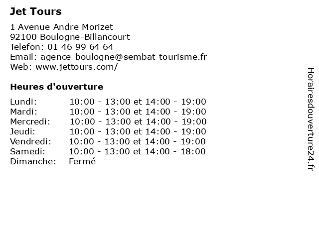 1 Jet Tours (Distance: 0,13 km) 168 Boulevard Jean Jaurès, 92100 Boulogne-Billancourt agence, billet d'avion et hôtel pour votre club, jet, séjour, tours, voyage 2 Jet Tours (Distance: 1,25 km) 14 boulevard Jean Jaures, 92100 Boulogne-Billancourt agence, billet d'avion et hôtel pour votre club, jet, séjour, tours, voyage 3 Jet Tours (Distance: 3,91 km) 22 Avenue Jean Jaures, 92140 Clamart agence, billet d'avion et hôtel pour votre club, jet, séjour, tours, voyage 4 Jet Tours (Distance: 7,12 km) 61 rue Louise Michel, 92300 Levallois Perret agence, billet d'avion et hôtel pour votre club, jet, séjour, tours, voyage 5 Jet Tours (Distance: 7,14 km) 17 Rue Gabriel Peri, 92300 Levallois Perret agence, billet d'avion et hôtel pour votre club, jet, séjour, tours, voyage 6 Jet Tours (Distance: 8,18 km) 128 Avenue Du General Leclerc, 92340 Bourg La Reine agence, billet d'avion et hôtel pour votre club, jet, séjour, tours, voyage |