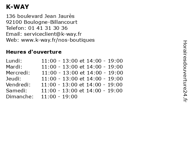 | Mercredi | 11:00-13:00 et 14:00-19:00 |