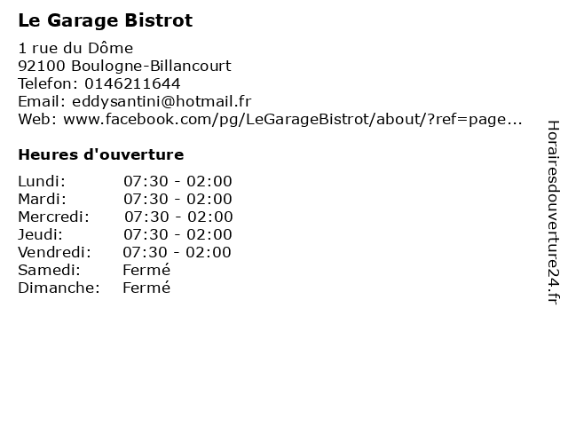 1 Le Garage Bistrot (Distance: 0,00 km) 1 Rue du Dome, 92100 Boulogne-Billancourt bar, bistro, bistrot, brasserie, café, garage, le, pub, restaurant, restauration, resto 2 Bistrot du Boucher (Distance: 1,94 km) 30 Avenue du Général Leclerc, 92130 Issy Les Moulineaux a la carte, bistrot, boucher, du, restaurant 3 Bistrot Dupleix (Distance: 3,46 km) 62 boulevard Grenelle, 75015 PARIS bar, bistrot, brasserie, cafe, cuisine française, dupleix, restaurant 4 Bistrot du Boucher (Distance: 6,52 km) 41 Avenue de l'Europe, 78140 Velizy Villacoublay a la carte, bistrot, boucher, du, restaurant 5 Bistrot du Sommelier Paris (Distance: 6,62 km) 97 Boulevard Haussmann, 75008 Paris bistrot, du, food, paris, restaurant, sommelier 6 Le Bistrot de l’Echanson (Distance: 6,92 km) 18 rue Baudin, 92400 Courbevoie bistrot, de, le, l’echanson, restaurant |