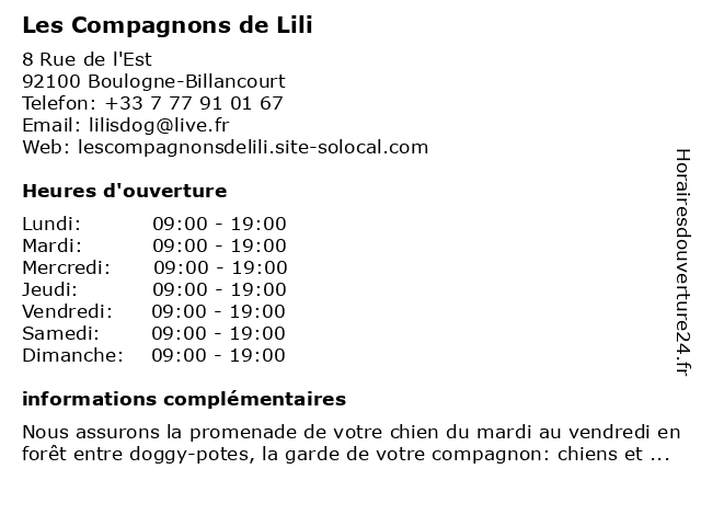 1 Lili la Mariée (Distance: 0,17 km) 30 Rue Thiers, 92100 Boulogne-Billancourt accessoires, la, lili, mariage, mariée, robes, vêtements 2 Lili Cabas (Distance: 0,98 km) 10 Boulevard Jean Jaurès, 92100 Boulogne-Billancourt accessoires, cabas, chaussures, foulards, lili, lili cabas, sac 4 Lili's Brownies (Distance: 5,48 km) 17 Boulevard de Vaugirard, 75741 Paris brownies, cafe, chaussures, enfants, homme, lili's, mode femme, restaurant, service, sport 5 Institut de Beauté Lili (Distance: 7,30 km) 9 Rue Danton, 75006 Paris beauté, de, institut, institut de beauté, lili, manucure, pieds, soins, spa, épilations 6 Conservatoire Municipal Nadia et Lili Boulanger (Distance: 8,46 km) 17 Rue de Rochechouart, 75009 Paris boulanger, conservatoire, conservatoires, equipement, et, l'heure, lili, livre, municipal, médiathèque, nadia, services |