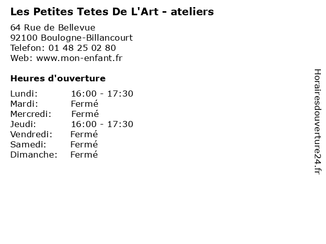 1 Les Petites Tetes De L'Art - les enfants en halte garderie (Distance: 0,00 km) 64 Rue de Bellevue, 92100 Boulogne-Billancourt caregivers houses, child care, de, en, enfants, family home, garderie, halte, home care, kindergartens, l'art, les, micro-nurseries, parental home, petites, tetes 2 Art et Fenêtres (Distance: 6,95 km) 180 avenue du Maine, 75014 Paris art, doors, entrance doors, et, fenêtres, gates and fences, shutters, windows 3 Bibliothèque d'Histoire et d'Historie de L'Art (Distance: 7,72 km) 2 Allée de l'Université, 92001 Nanterre bibliothèque, d'histoire, d'historie, de, et, l'art, librarie, médiathèque, services, université 4 Art hotel Congres 3 étoiles (Distance: 8,20 km) 6 Rue Lebouteux, 75017 Paris art, bar, chambres, congres, hotel, restaurant, étoiles 5 Relais Colis® / ART IMAGES FS (Distance: 9,80 km) 19 Rue du general leclerc, 94270 LE KREMLIN BICETRE art, colis, colis®, fs, images, relais, services postaux et de livraison 6 Art Hôtel Lafayette (Distance: 9,99 km) 98 Rue d'Hauteville, 75010 Paris art, cafe, hotel, hôtel, lafayette, restaurant, service |