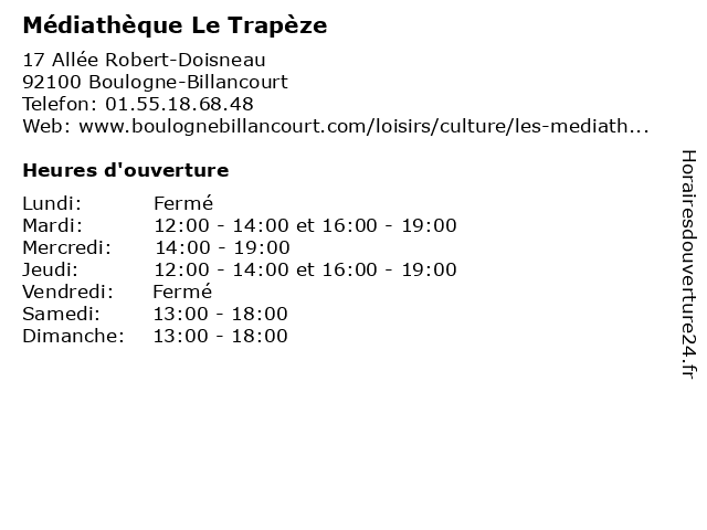 1 CrossFit le Trapèze (Distance: 0,34 km) 32 rue Marcel Bontemps, 92100 Boulogne-Billancourt billancourt, boulogne, crossfit, le, trapèze 2 Médiathèque Billancourt (Distance: 0,49 km) 11 bis Rue de Clamart, 92100 Boulogne-Billancourt billancourt, dvd, livres, municipale, médiathèque 3 Médiathèque Landowski - Adultes (Distance: 0,76 km) 28 avenue André-Morizet, 92100 Boulogne-Billancourt adultes, cd audio, cd.rom, horaires, landowski, livres, médiathèque, revues 4 Médiathèque Landowski - Jeunesse (Distance: 0,76 km) 28 avenue André-Morizet, 92100 Boulogne-Billancourt cd audio, cd.rom, hors, jeunesse, landowski, livres, médiathèque, revues, scolaires, vacances 5 Médiathèque Landowski - Jeunesse (petites vacances scolaires) (Distance: 0,76 km) 28 avenue André-Morizet, 92100 Boulogne-Billancourt cd audio, cd.rom, jeunesse, landowski, livres, médiathèque, petites, revues, scolaires, vacances 6 Médiathèque Parchamp (Distance: 1,92 km) 4 bis Avenue Charles-de-Gaulle, 92100 Boulogne-Billancourt dvd, livres, municipale, médiathèque, parchamp |
