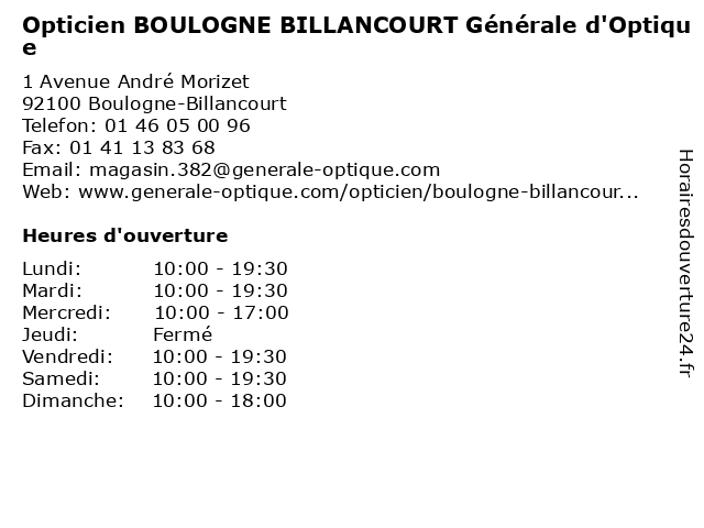 1 MANÉO Opticiens - Opticien Boulogne-Billancourt (Distance: 0,10 km) 103 Avenue Edouard Vaillant, 92100 Boulogne-Billancourt billancourt, boulogne, boulogne billancourt, contactologie, contactologie boulogne billancourt, experts en santé visuelle, lentilles boulogne billancourt, lentilles de contact boulogne billancourt, lunettes boulogne billancourt, lunettes de soleil boulogne billancourt, lunettes de sport boulogne billancourt, manéo, opticien, opticien 92, opticien 92100, opticien boulogne billancourt, opticien ile de france, opticien optometriste boulogne billancourt, opticiens, optometriste boulogne billancourt, optométrie, verres progressifs boulogne billancourt, vision de l'enfant 2 Opticien Boulogne-Billancourt - Optic 2000 - A côté du Monoprix (Distance: 0,11 km) 177 Boulevard Jean Jaurès, 92100 Boulogne-Billancourt 2000, billancourt, boulogne, côté, du, lentilles de contact, lunettes de soleil, lunettes de vue, monoprix, optic, optic2000, opticien, opticien optic2000, ray-ban, rayban 3 Carré de l'Optique (Distance: 0,38 km) 80-82 rue Gallieni, 92100 Boulogne Billancourt carré, de, entretien, l'optique, lentilles, lunettes, opticien, solaire, vue 4 Opticien Boulogne-Billancourt | Alain Afflelou - Closed (Distance: 0,46 km) Centre Commercial Les Passages, 92100 Boulogne-Billancourt afflelou, alain, billancourt, boulogne, closed, magasin de lunettes de soleil, opticien, optométrie 5 Lissac l'Opticien (Distance: 0,96 km) 123 rue du Château, 92100 Boulogne-Billancourt l'opticien, lentilles, lissac, lunettes, optic, opticien, optique, vision, vue 6 Opticien Générale d'Optique (Distance: 1,58 km) Allée Sainte-Lucie, 92130 Issy-les-Moulineaux d'optique, générale, opticien |