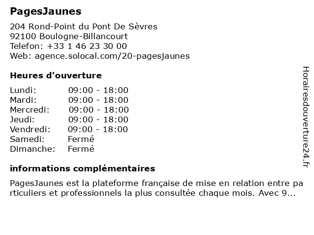 1 Solocal Paris - Conseils pagesjaunes (Distance: 0,00 km) 204 Rond Point du Pont De Sèvres, 92100 Boulogne-Billancourt conseils, pagesjaunes, paris, solocal 2 CFDT PagesJaunes - Solocal (Distance: 0,03 km) 204 Rond Point du Pont De Sèvres, 92100 Boulogne-Billancourt cfdt, pagesjaunes, solocal 3 Pagesjaunes Boulogne (Distance: 1,73 km) 24 Rue d'Aguesseau, 92100 Boulogne-billancourt boulogne, pagesjaunes |