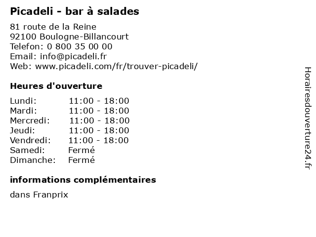 1 Picadeli - bar à salades (Distance: 0,87 km) 35 avenue du Général Leclerc, 92100 Boulogne-Billancourt bar, boisson, fastfood, picadeli, restauration, salades 2 Picadeli - bar à salades (Distance: 1,35 km) 64 Rue Marcel Bontemps, 92100 Boulogne-Billancourt bar, boisson, fastfood, picadeli, restauration, salades 3 Picadeli - bar à salades (Distance: 3,76 km) 259 Rue Lecourbe, 75015 Paris bar, boisson, fastfood, picadeli, restauration, salades 4 Picadeli - bar à salades (Distance: 4,03 km) 169 Rue Blomet, 75015 Paris bar, boisson, fastfood, picadeli, restauration, salades 5 Picadeli - bar à salades (Distance: 5,42 km) 99 Rue Saint-Dominique, 75007 Paris bar, boisson, fastfood, picadeli, restauration, salades 6 Picadeli - bar à salades (Distance: 5,50 km) 13 rue Eblé, 75007 Paris bar, boisson, fastfood, picadeli, restauration, salades |