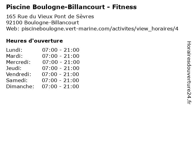 1 Piscine Boulogne-Billancourt - Période Scolaire (Distance: 0,00 km) 165 Rue du Vieux Pont de Sèvres, 92100 Boulogne-Billancourt bain, billancourt, boulogne, l'eau, l'été, la natation, le plaisir, le soleil, piscine, période, scolaire 2 Piscine Boulogne-Billancourt - Vacances Scolaires (Distance: 0,00 km) 165 Rue du Vieux Pont de Sèvres, 92100 Boulogne-Billancourt bain, billancourt, boulogne, l'eau, l'été, la natation, le plaisir, le soleil, piscine, scolaires, vacances 3 Piscine Sevestre - piscine, bien-être (Vacances scolaires) (Distance: 1,98 km) 70 boulevard Gallieni, 92130 Issy-les-Moulineaux aqua, aquatique, bien, piscine, scolaires, sevestre, vacances, être 4 Piscine Sevestre - piscine, bien-être (Grandes vacances) (Distance: 1,98 km) 70 boulevard Gallieni, 92130 Issy-les-Moulineaux aqua, aquatique, bien, grandes, piscine, sevestre, vacances, être 5 CMG Sports Club - Horaires D'Ouverture de la Piscine (Distance: 2,25 km) 11 rue Chanez, 75016 Paris club, cmg, d'ouverture, de, exercise, fitness, health, horaires, la, outdoor, physical activities, piscine, sports 6 Piscine municipale Guy Bey - piscine (Périodes scolaires) (Distance: 2,73 km) 23 rue Charles Infroit, 92190 Meudon aqua, aquatique, bey, guy, municipale, piscine, périodes, scolaires |