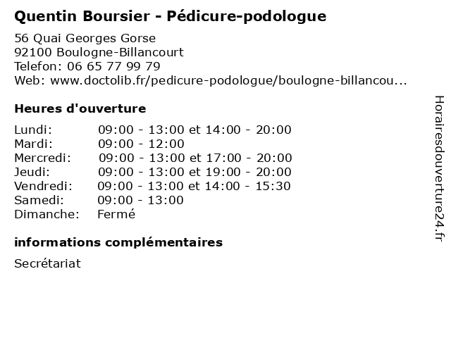 1 Kevin Boursier - Ostéopathe (Distance: 0,00 km) 56 Quai Georges Gorse, 92100 Boulogne-Billancourt actes et symptômes, bilan podologique, boursier, expertises, kevin, ostéopathe, ostéopathie crânienne 2 Catherine Bladier Monot - Pédicure-podologue (Distance: 0,42 km) 93 Allée du Forum, 92100 Boulogne-Billancourt bladier, catherine, cheville, monot, orteil, pied, podologue, pédicure 3 Didier Zerah - Pédicure-podologue (Distance: 1,03 km) 1 Avenue Pierre Grenier, 92100 Boulogne-Billancourt didier, orthoplastie, podologue, pédicure, pédicurie, zerah 4 Maiwenn Jardel - Pédicure-podologue - secrétariat (Distance: 1,06 km) 34 Rue Carnot, 92100 Boulogne-Billancourt consultation, docteur, jardel, maiwenn, médecin, médecine, podologue, pédicure, pédicure-podologue, secrétariat, traitement 5 Carole Marie - Pédicure-podologue - secrétariat (Distance: 1,06 km) 34 Rue Carnot, 92100 Boulogne-Billancourt carole, consultation, docteur, marie, médecin, médecine, podologue, pédicure, pédicure-podologue, secrétariat, traitement 6 Martine Procot - Pédicure-podologue - secrétariat (Distance: 1,06 km) 34 Rue Carnot, 92100 Boulogne-Billancourt consultation, docteur, martine, médecin, médecine, podologue, procot, pédicure, pédicure-podologue, secrétariat, traitement |