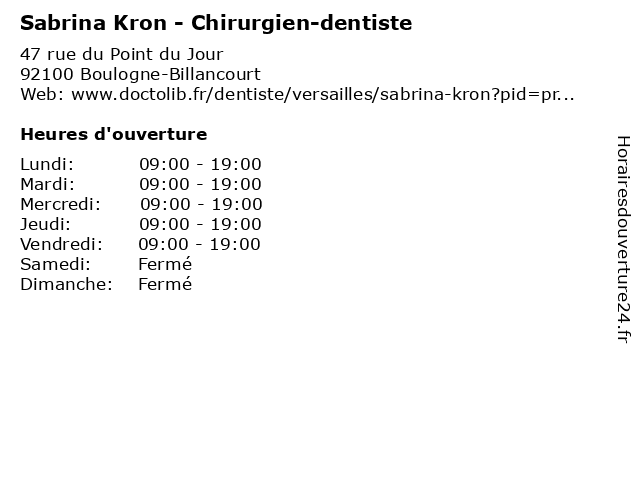 1 Sabrina Jourdan - Masseur-kinésithérapeute (Distance: 0,53 km) 48 Rue Claude Terrasse, 75016 Paris jourdan, kiné, kinésithérapeute, masseur, rééducation, sabrina, soin 2 Sabrina Lemenager - Ostéopathe (Distance: 0,85 km) 211 Boulevard Jean Jaurès, 92100 Boulogne-Billancourt bien-être, lemenager, ostéopathe, sabrina, santé, services 3 Dr Sabrina Ma - Médecin généraliste (Distance: 1,58 km) 27 bis Avenue Victor Cresson, 92130 Issy-les-Moulineaux dr, généraliste, ma, médecin, médecine, médical, pharmaceutique, sabrina, secrétariat, traitement 4 Dr Sabrina Ma - Médecin généraliste (Distance: 1,75 km) 44 Rue d'Erevan, 92130 Issy-les-Moulineaux docteur, dr, généraliste, généraux, ma, médecin, sabrina, soins 5 Dr Cédric Kron - Chirurgien plasticien et esthétique (Distance: 1,94 km) 21 rue de Rémusat, 75016 Paris chirurgien, consultation, cédric, docteur, dr, esthétique, et, kron, med, médecin, médecine, plasticien, traitement 6 Sabrina Rives - Hypnothérapeute (Distance: 2,27 km) 85 Avenue Mozart, 75016 Paris hypno, hypnose, hypnothérapeute, rives, sabrina, sante |