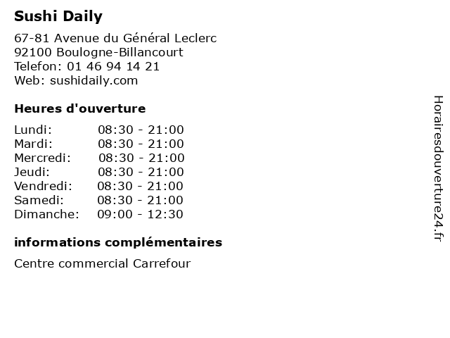 1 Sushi Daily (Distance: 0,90 km) 5 rue Tony Garnier, 92100 Boulogne-Billancourt daily, emporter, japonais, makis, restaurant, sushi, vente 2 Sushi Daily (Distance: 8,85 km) 22 avenue du Général de Gaulle, 78290 Croissy-sur-Seine daily, emporter, japonais, makis, restaurant, sushi, vente 3 Sushi Daily (Distance: 8,97 km) 30 avenue d'Italie, 75013 Paris daily, emporter, japonais, makis, restaurant, sushi, vente 4 Sushi Daily (Distance: 8,97 km) 30 avenue d'Italie, 75013 Paris daily, emporter, japonais, makis, restaurant, sushi, vente 5 Sushi Daily (Distance: 9,50 km) 165 Rue Nationale, 75013 Paris daily, emporter, japonais, makis, restaurant, sushi, vente 6 Sushi Daily (Distance: 9,50 km) 165 Rue Nationale, 75013 Paris daily, emporter, japonais, makis, restaurant, sushi, vente |