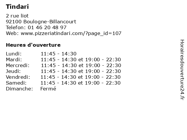 | Mardi | 11:45-14:30 et 19:00-22:30 |