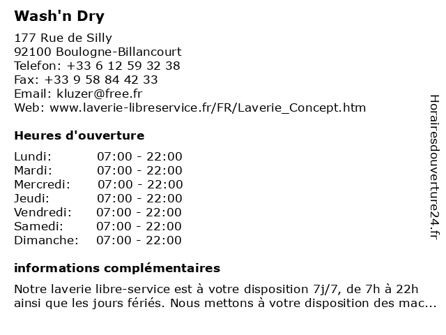 1 Wash'n Dry (Distance: 5,35 km) 19 Rue de la Procession, 75015 Paris dry, laverie, maintenance, service, wash'n 2 Wash'n Dry (Distance: 5,37 km) 146 Boulevard Gabriel Péri, 92240 Malakoff dry, laverie, maintenance, service, wash'n 3 Wash'n Dry (Distance: 8,44 km) 18 Rue du Château, 92250 La Garenne dry, laverie, maintenance, service, wash'n 4 Wash'n Dry (Distance: 9,30 km) 18 Rue Fernand Pelloutier, 92110 Clichy dry, laverie, maintenance, service, wash'n 5 Wash'n Dry (Distance: 12,30 km) 12 Rue Henri Barbusse, 95100 Argenteuil dry, laverie, maintenance, service, wash'n 6 Wash'n Dry (Distance: 14,23 km) 79 Rue Jean Jaures, 93300 Aubervilliers dry, laverie, maintenance, service, wash'n |