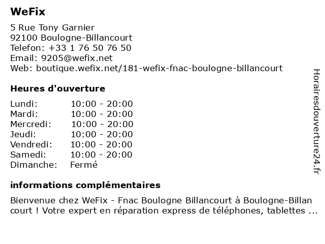 1 WeFix (Distance: 6,15 km) 26 avenue des Ternes, 75017 Paris réparation, services, technique, wefix, électronique 3 WeFix (Distance: 6,22 km) 2 Place de La Défense, 92800 Puteaux réparation, services, technique, wefix, électronique 4 WeFix (Distance: 6,26 km) 76 Rue de la Demi Lune, 92800 Puteaux réparation, services, technique, wefix, électronique 5 WeFix (Distance: 8,32 km) 101 Porte Berger, 75001 Paris réparation, services, smartphone, tablette, technique, wefix 6 WeFix (Distance: 8,58 km) 30 Avenue d'Italie, 75013 Paris allo, repair, service, smartphone, tablette, wefix  |