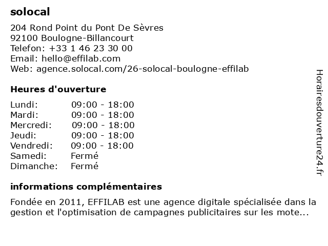 2 Solocal Paris - Siège social (Distance: 0,01 km) 204 Rond Point du Pont De Sèvres, 92100 Boulogne-Billancourt paris, siège, social, solocal 3 Solocal Paris - Conseils pagesjaunes (Distance: 0,02 km) 204 Rond Point du Pont De Sèvres, 92100 Boulogne-Billancourt conseils, pagesjaunes, paris, solocal 4 CFDT PagesJaunes - Solocal (Distance: 0,05 km) 204 Rond Point du Pont De Sèvres, 92100 Boulogne-Billancourt cfdt, pagesjaunes, solocal |