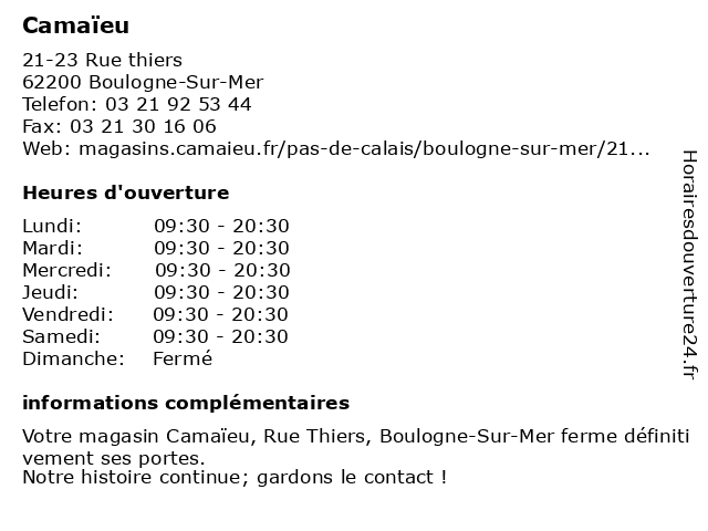 2 Camaïeu (Distance: 45,68 km) 32 rue de Dunkerque, 62500 Saint Omer boutiques, camaïeu, clothings, pants, shirts 3 Camaïeu (Distance: 49,40 km) - Route d'Arques, 62219 Longuenesse accessoires, boutiques, camaïeu, chemises, pantalons, vêtements 4 Camaïeu (Distance: 49,40 km) - Route d'Arques, 62219 Longuenesse boutiques, camaïeu, clothings, pants, shirts 5 Camaïeu (Distance: 56,25 km) 40 rue de l'Ancienne, 59760 Grande-Synthe accessoires, boutiques, camaïeu, chemises, pantalons, vêtements |