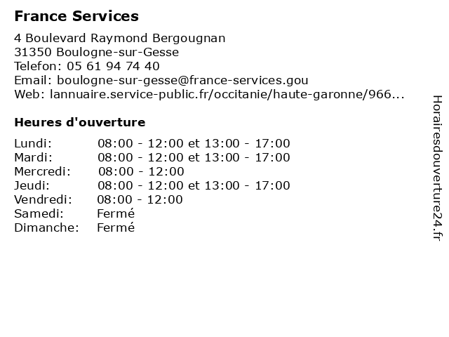 | Lundi | 08:00-12:00 et 13:00-17:00 |