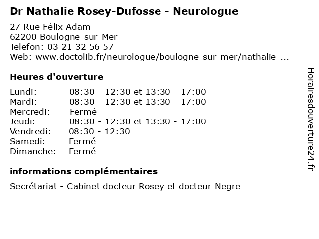 2 Dr Arnaud Negre - Neurologue (Distance: 0,00 km) 27 Rue Félix Adam, 62200 Boulogne-sur-Mer arnaud, cerveau, dr, negre, nerf, neurologie, neurologue 3 Dr Nathalie Gury - Médecin généraliste (Distance: 0,34 km) 4 Rue de Boston, 62200 Boulogne-sur-Mer docteur, dr, generaliste, gury, généraliste, medecin, médecin, nathalie, soins 4 Dr Nathalie Rousselot Gur - Médecin généraliste - secrétariat (Distance: 0,56 km) 60 Rue du Camp de Droite, 62200 Boulogne-sur-Mer consultation, docteur, dr, gur, généraliste, med, médecin, médecine, nathalie, rousselot, secrétariat, traitement 5 Debette Lassalle Nathalie Fernande (Distance: 2,92 km) 2 Rue Carnot, 62480 Le Portel debette, fernande, lassalle, nathalie, restaurants 6 Dr Nathalie Cottreel-Lefevre - Médecin généraliste (Distance: 6,37 km) 17 Route d'Equihen, 62360 Saint-Étienne-au-Mont cottreel, docteur, dr, generaliste, généraliste, lefevre, medical, médecin, nathalie, soin |