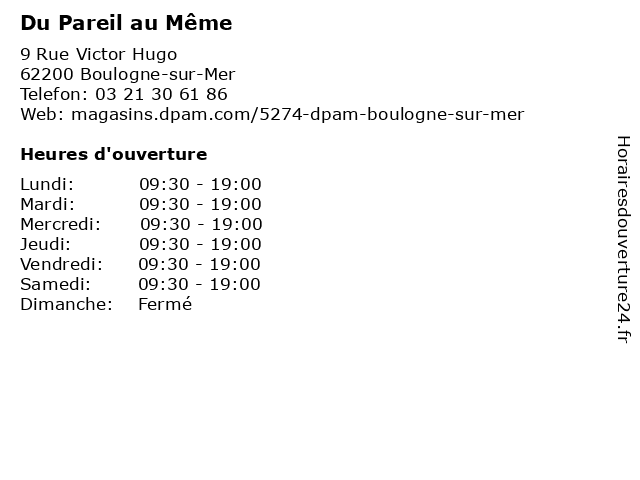 1 Dpam (Distance: 0,02 km) 9 Rue Victor Hugo, 62200 Boulogne Sur Mer affaires, boutique, dpam, produit, service, vêtements 2 Du Pareil au Même (Distance: 35,41 km) 26 Rue Carnot, 62600 Berck au, boutiques, dpam, du, même, pareil, styles, vêtements 3 Dpam (Distance: 35,49 km) 26 Rue Carnot, 62600 Berck affaires, boutique, dpam, produit, service, vêtements 4 SFR Boulogne Sur Mer (Distance: 0,03 km) 2 Rue Victor Hugo, 62200 Boulogne Sur Mer boulogne, compagnie de téléphone, magasin de téléphones mobiles, mer, sfr, sur, vente et installation du câble et du satellite 5 Au Bureau (Distance: 0,10 km) 12/14 Place Dalton, 62200 Boulogne-sur-Mer au, bar, bar sportif, bureau, pub, restaurant de hamburgers, restaurant européen, restaurant français, restaurant irlandais, taverne 6 Opticien Krys (Distance: 0,16 km) 32 Place Dalton, 62200 Boulogne-sur-mer krys, magasin de lentilles correctrices, magasin de lunettes de soleil, magasin d’accessoires de mode, opticien, optométrie |