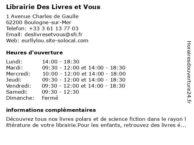 | Mardi | 09:30-12:00 et 14:00-18:30 |