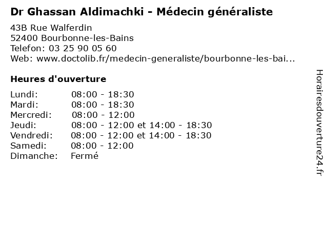 1 Dr Ghassan Aldimachki - Médecin généraliste (Distance: 0,00 km) 43b Rue Walferdin, 52400 Bourbonne-les-Bains aldimachki, docteur, dr, generaliste, ghassan, généraliste, medical, médecin, soin 2 Ref Interne 148281 (Distance: 34,02 km) Elres , 88240 Fontenoy Le Chateau 148281, elres, interne, ref, restaurants 3 Dr Pierre Daoudal - Spécialiste en médecine interne (Distance: 45,97 km) 2 rue Heymès, 70014 Vesoul consultation, daoudal, docteur, dr, en, interne, med, medecine, medical, médecin, médecine, pierre, spécialiste, traitement 4 Dr Fabrice Coutier - Spécialiste en médecine interne (Distance: 45,98 km) 2 Rue René Heymes, 70000 Vesoul consultation, coutier, docteur, dr, en, fabrice, interne, med, médecin, médecine, spécialiste, traitement 5 Dr Cécile Golden - Spécialiste en médecine interne (Distance: 45,98 km) 2 Rue René Heymes, 70000 Vesoul consultation, cécile, docteur, dr, en, golden, interne, med, médecin, médecine, spécialiste, traitement 6 Dr Cyril Faure - Médecin interniste (Distance: 46,02 km) 2 rue Heymès, 70014 Vesoul cyril, de, dr, faure, groupe, générale, haute, hospitalier, interne, interniste, la, maladie, médecin, saône, site, vesoul |