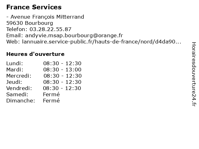| 1 France Services (Distance: 12,49 km) 3393 Avenue De Petite Synthe, 59640 Dunkerque administration, communes, france, service, services, services publics 2 France Services (Distance: 15,63 km) 5 La place, 62910 Eperlecques administration, communes, france, service, services, services publics 3 France Services (Distance: 17,43 km) - Avenue de la Liberté, 59380 Bergues administration, communes, france, service, services, services publics 4 Maison de Services au Public (Distance: 18,12 km) 15 Place de Tassencourt, 62610 Ardres agents, au, de, maison, mission locale, public, services, services au 5 Agence Blondel - l'Immobilier De France (Distance: 21,93 km) 59 Place Du Marechal Foch, 62500 St Omer agence, agents, blondel, de, directeurs, france, if, immobilier, immobiliers, l'immobilier, omer, saint 6 Maison de Services au Public (Bureau de Poste) (Distance: 26,97 km) 4 Rue du Général Donet, 59173 Renescure agents, au, bureau, de, maison, mission locale, poste, public, services, services au |