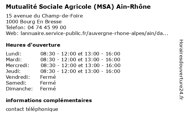 1 Mutualité sociale agricole (MSA) Ain-Rhône (Distance: 0,03 km) 15 avenue du Champ de Foire, 01000 Bourg-en-Bresse accueil, agricole, ain, information, msa, mutualité, mutuelle, rhône, santé, sociale 2 Présence Verte Rhône Alpes (Distance: 0,01 km) 15 Avenue du Champ de Foire, 01000 Bourg-en-Bresse alpes, présence, rhône, verte 3 Carsat Rhône-Alpes Agence Retraite (Distance: 0,01 km) 15 Avenue du Champ de Foire, 01000 Bourg-en-Bresse agence, alpes, carsat, retraite, rhône 4 Fédération Départementale des Cuma de l'Ain (Distance: 0,09 km) 4 Avenue du Champ de Foire, 01000 Bourg-en-Bresse agriculture, association, coopératives, cuma, de, des, départementale, fédération, l'ain 5 Chambre d'agriculture de l'Ain (Distance: 0,11 km) 4 avenue du Champ de Foire, 01000 Bourg en Bresse agriculteur, chambre, d'agriculture, de, l'ain, organisation 6 Safer Auvergne Rhône Alpes (Distance: 0,11 km) 4 avenue du Champ de Foire, 01003 Bourg-en-Bresse accompagnements, agricoles, alpes, auvergne, projets, propriétés, rhône, rurales, safer |