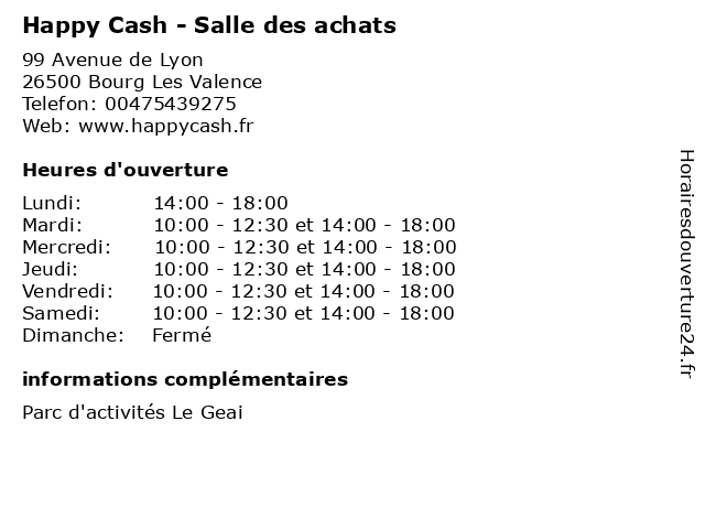 1 Happy Cash - Magasin (Distance: 0,00 km) 99 Avenue de Lyon, 26500 Bourg-Lès-Valence achat, cash, happy, magasin, occasion, produits, revente, réparation 2 Restaurant Happy Panda (Distance: 2,19 km) 83 Avenue Sadi Carnot, 26000 Valence asiatique, buffet, chinois, happy, japonais, panda, restaurant, restauration, spécialités 3 Orpi Happy Dev Valence (Distance: 2,38 km) 21 Avenue Félix Faure, 26000 Valence dev, happy, orpi, valence 4 5 Cash Converters (Distance: 2,62 km) 1449 Avenue de la République, 07500 Guilherand-Granges achat, cash, converters, vente 6 Cash Converters (Salle d'Achats) (Distance: 2,66 km) 7 rue du Levant, 07130 Saint Péray boutique, cash, converters, d'achats, multimédia, salle, électroménagerm |