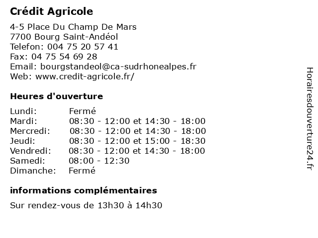 | 1 Crédit Agricole (Distance: 0,33 km) 435 Route de Bourg-Saint-Andéol, 07700 Saint-Just d'Ardèche agence, agricole, assurance, bancaire, banque, crédit 2 Crédit Agricole (Distance: 4,43 km) - Rue du Docteur Jaume, 26700 Pierrelatte agence, agricole, assurance, bancaire, banque, crédit 3 Crédit Agricole (Distance: 9,68 km) 13 Place du Champ de Mars, 26290 Donzère agence, agricole, assurance, bancaire, banque, crédit 4 Crédit Agricole (Distance: 10,03 km) - Place de la Libération, 26130 Saint-Paul-Trois-Châteaux agence, agricole, assurance, bancaire, banque, crédit 5 Crédit Agricole (Distance: 12,57 km) - Place Saint-Michel, 30130 Pont-Saint-Esprit agricole, assurances, bancaire, banque, crédit, gascogne, mutuel, pyrénées, services 6 Crédit Agricole (Distance: 18,24 km) - Avenue des Côtes du Rhône, 26790 Suze La Rousse agricole, assurance, banque, credit, crédit, epargne, gascogne, mutuel, pyrénées, services |