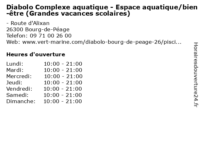 1 Diabolo Complexe Aquatique (Vacances scolaires) (Distance: 0,00 km) - Route d'Alixan, 26300 Bourg-de-Péage aqua, aquatique, complexe, diabolo, espace, piscine, scolaires, vacances 2 Diabolo Complexe aquatique - espace bien-être (Vacances scolaires) (Distance: 0,54 km) - Route d'Alixan, 26300 Bourg-de-Péage aqua, aquatique, bien, complexe, diabolo, espace, piscine, scolaires, vacances, être 3 Diabolo Complexe aquatique - espace bien-être (Période scolaire) (Distance: 0,54 km) - Route d'Alixan, 26300 Bourg-de-Péage aqua, aquatique, bien, complexe, diabolo, espace, piscine, période, scolaire, être 4 Diabolo Complexe aquatique - espace aquatique (Période scolaire) (Distance: 0,54 km) - Route d'Alixan, 26300 Bourg-de-Péage aqua, aquatique, complexe, diabolo, espace, piscine, période, scolaire 5 Diabolo Complexe aquatique - espace aquatique (Vacances scolaires) (Distance: 0,54 km) - Route d'Alixan, 26300 Bourg-de-Péage aqua, aquatique, complexe, diabolo, espace, piscine, scolaires, vacances 6 O Diabolo Pause Bistronomique (Distance: 3,85 km) O Diabolo Pause Bistronomique Complexe, 26300 Bourg De Peage bistronomique, diabolo, maog, pause, restaurants |