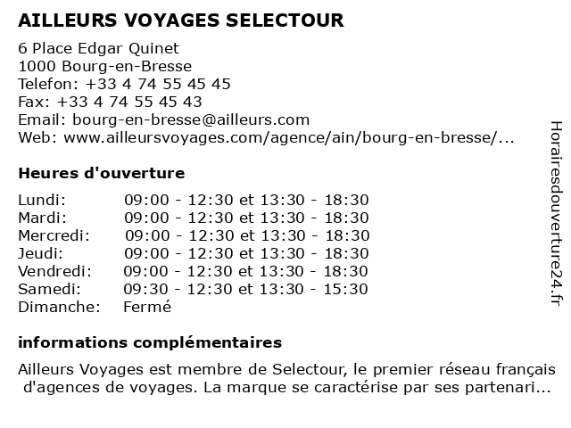 1 Jetset Voyages / Ailleurs Voyages (Distance: 0,00 km) 6 Place Edgar Quinet, 01000 Bourg En Bresse agence, ailleurs, billet d'avion et hôtel pour votre club, jetset, séjour, voyages 2 Selectour - Ailleurs Voyages (Distance: 0,00 km) 6 place Edgar Quinet, 01000 Bourg-en-Bresse ailleurs, billets de train, selectour, séjours, vols, voyage, voyages 3 Fram Voyages (Distance: 0,28 km) 3 Place Clemenceau, 01000 Bourg En Bresse agence, billet d'avion et hôtel pour votre club, fram, séjour, voyage, voyages 4 Look Voyages (Distance: 0,31 km) 1 Cours de Verdun, 01000 Bourg En Bresse agence, billet d'avion et hôtel pour votre club, look, séjour, voyage, voyages 5 Selectour - Itinéa Voyages (Distance: 0,33 km) 1 Cours de Verdun, 01000 Bourg en Bresse billets de train, itinéa, selectour, séjours, vols, voyage, voyages 6 Bresse Voyages (Distance: 0,35 km) 11 rue Charles Robin, 01000 Bourg-en-Bresse bresse, réservations, séjours, vacances, voyages |