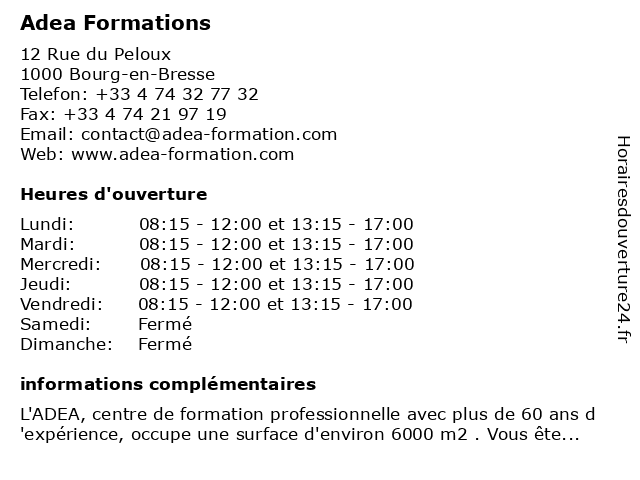 | Lundi | 08:15-12:00 et 13:15-17:00 |