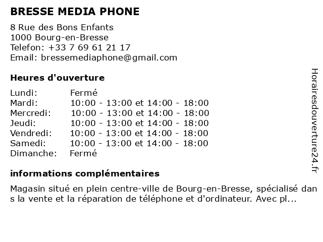 Samedi | 10:00-13:00 et 14:00-18:00 |