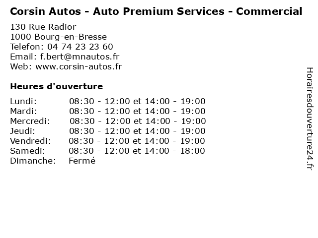 1 Corsin Autos - Auto Premium Services - Atelier (Distance: 0,00 km) 130 Rue Radior, 01000 Bourg-en-Bresse atelier, auto, automobile, autos, corsin, entretien, garage, neuf, occasion, premium, réparation, services, vente, vidange 2 BMW Bresse Auto Sport - Service commercial (Distance: 1,81 km) 40 rue Gay Lussac, 01440 Viriat auto, automobile, bmw, bresse, commercial, concessionnaire, entretien, neuve, occasion, réparation, service, sport, vente 3 Espace premium (Distance: 2,36 km) 6 Rue victor basch, 01000 Bourg en bresse bourg en bresse, espace, institut de beauté, premium 5 Net'Auto Premium (Distance: 6,35 km) 951 Route de Pont d'Ain, 01250 Montagnat atelier, lustrage, net'auto, nettoyage, premium, voitures 6 Spoticar Mondial Autos (Distance: 6,63 km) 36 rue Ampère, 01960 Péronnas après, atelier, automobile, autos, concessionnaire, garage, mondial, neuve, occasion, opel, réparation, sa, spoticar, vente |