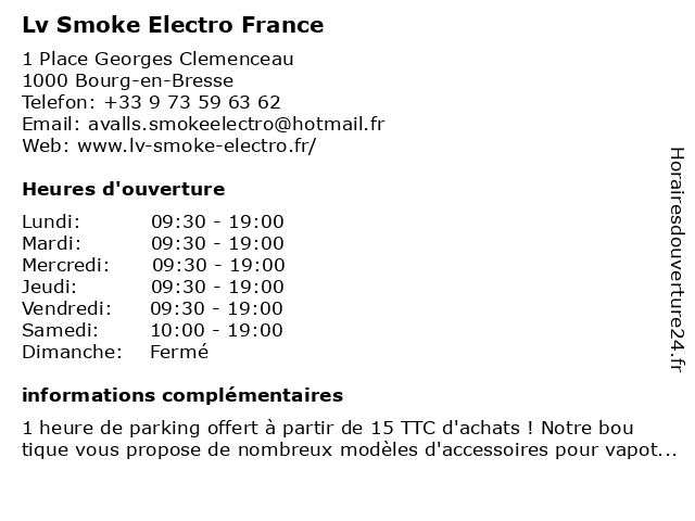 1 Lv Smoke Electro France (Distance: 0,15 km) 16 Rue Samaritaine, 01000 Bourg-en-Bresse accessoires, boutique, cigarette, electro, france, lv, magasin, smoke, électronique 3 LV Coiffure (Distance: 54,72 km) 117 Rue de Château Gaillard, 69100 Villeurbanne beauté, coiffeur, coiffure, coloration, coupe, lv, shampooing 4 Coralie LV Coiffure (Distance: 55,33 km) 9 Rue Marius Berliet, 69380 Chazay-d'Azergues barbier, coiffeur, coiffure, coloration, coralie, coupe, lv, shampooing 5 Smoke n' Vap'Z (Distance: 56,39 km) 291 cours Lafayette, 69006 Lyon boutique, e-cigarette, e-liquide, n', smoke, vap'z, électronique 6  |