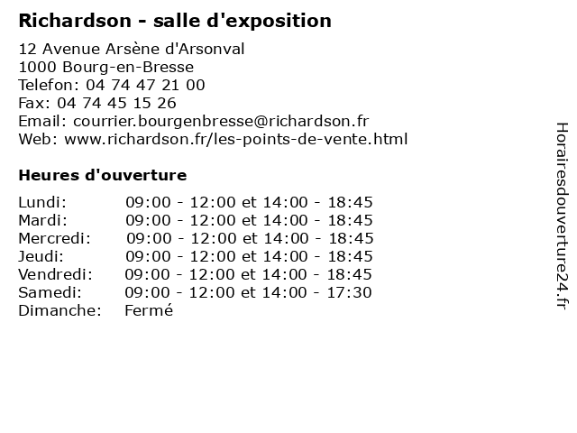 1 Richardson - magasin et libre service (Distance: 0,00 km) 12 Avenue Arsène d'Arsonval, 01000 Bourg-en-Bresse aménagement, equipement, et, libre, magasin, mobilier, richardson, service 2 Richardson - Clim-Ventil (Distance: 0,00 km) 12 avenue Arsène d'Arsonval, 01000 Bourg-en-Bresse bains, carrelage, chauffage, clim, meubles, outilage, richardson, ventil 3 Point P (Salle d'Exposition) (Distance: 0,04 km) 8 Rue Barthelemy Thimonnier, 01000 Bourg-en-Bresse aménagement, construction, d'exposition, matériaux, point, salle 4 Decoceram (salle d'exposition) (Distance: 1,54 km) - Rue des Cables de Lyon, 01000 St Denis les Bourg carrelage, d'exposition, decoceram, decoration, salle 5 L'Appart Fitness - salle de sport Bourg-en-Bresse (Distance: 1,86 km) 70c Avenue François Pignier, 01000 Bourg-en-Bresse bourg, bresse, de, en, fitness, l'appart, salle, sport 6 Richardson (Distance: 34,38 km) 1 Rue François Rochaix, 01100 Arbent aménagement, equipement, mobilier, richardson |