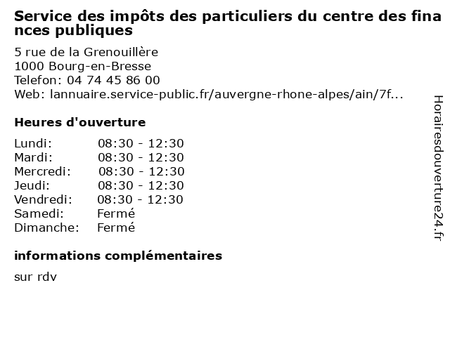 1 Centre des Impôts Foncier de Bourg-en-Bresse (Distance: 0,00 km) 5 Rue de la Grenouillère, 01012 Bourg-en-Bresse administration, assoc, bourg, bresse, centre, de, des, en, foncier, impôts, services, services publics 2 Centre Des Impôts - Bourg En Bresse Impôts (Distance: 0,03 km) 5 Rue De La Grenouillère, 01000 Bourg-en-Bresse administration, assoc. - services publics, bourg, bresse, centre, des, en, impôts 3 Centre Des Impôts - Bourg En Bresse Trésor Public (Distance: 0,11 km) 14 Rue De La Grenouillère, 01000 Bourg-en-Bresse administration, assoc. - services publics, bourg, bresse, centre, des, en, impôts, public, trésor 4 Centre Des Impôts - Bourg En Bresse Trésor Public (Distance: 0,21 km) 8 Rue Gabriel Vicaire, 01000 Bourg-en-Bresse administration, assoc. - services publics, bourg, bresse, centre, des, en, impôts, public, trésor 6 Centre Des Impôts - Bourg En Bresse Trésor Public (Distance: 1,61 km) 34 Rue Du Général Delestraint, 01000 Bourg-en-Bresse administration, assoc. - services publics, bourg, bresse, centre, des, en, impôts, public, trésor |