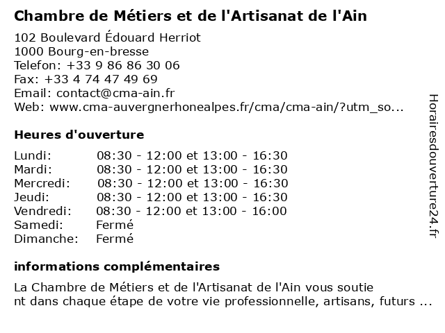 1 Ain Petit Service (Distance: 0,22 km) 3 Rue Xavier Privas, 01000 Bourg-en-Bresse ain, batiment, bourg-en-bresse, entrepreneur, isolatoin, petit, plombier, service, spécialisé 2 Chambre de métiers et de l'artisanat (CMA) (Distance: 0,37 km) 102 Boulevard Édouard-Herriot, 01004 Bourg-en-Bresse administration, assoc, chambre, cma, de, et, l'artisanat, métiers, services, services publics 3 Unité Départementale de l'Architecture et du Patrimoine (UDAP) - Ain (Distance: 0,41 km) 23 rue Bourgmayer, 01000 Bourg-en-Bresse administration, ain, de, du, départementale, et, l'architecture, organismes, patrimoine, publics, services, udap, unité 4 Ordre des Avocats - Barreau de l'Ain (Distance: 0,52 km) 18 rue Bourgmayer, 01000 Bourg-en-Bresse administration, avocat, avocats, barreau, de, des, justice, l'ain, ordre 5 Green Acres (Agc Ain Immo) (Distance: 0,58 km) 24 Rue Des Casernes, 01000 Bourg En Bresse acres, agc, ain, apartment rentals, green, home sales, immo, real estate 6 Chambre D'agriculture De L'ain (Distance: 0,62 km) 4 Avenue du Champ de Foire, 01000 Bourg-en-Bresse chambre, d'agriculture, de, l'ain |