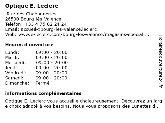 2 E.Leclerc Sports (Distance: 0,10 km) Rn 7 les chabanneries, 26500 Bourg Les Valence e.leclerc, magasin d'articles de ski, magasin de maillots de bain, magasin de vélos, sports 4 Leclerc - Borne de recharge électrique (Distance: 0,12 km) 221 Rue des Chabanneries, 26500 Bourg-lès-Valence borne, de, leclerc, recharge, électrique 5 Voyages E. Leclerc Bourg lès Valence (Distance: 0,16 km) Rue des Chabanneries, 26500 Bourg-lès-Valence bourg, e., leclerc, lès, valence, voyages 6 Espace Culturel E. Leclerc (Distance: 0,18 km) Rue du Rhône, 26500 Bourg-lès-Valence culturel, e., espace, leclerc |