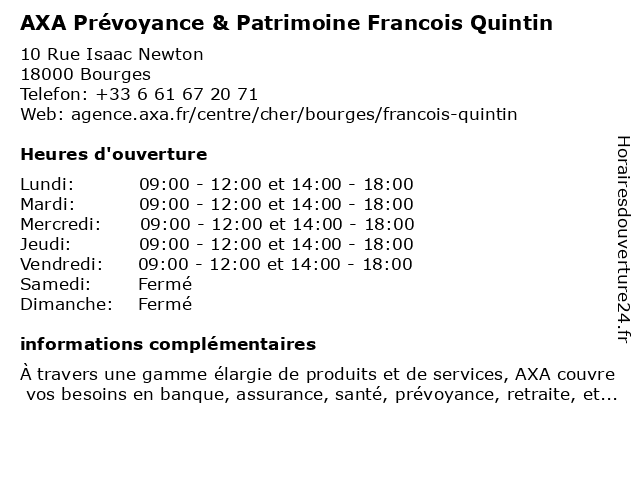 2 AXA Assurance et Banque Bourges Sarl Peslard Coum Ducrot (Distance: 0,30 km) 17 Rue Michael Faraday, 18000 Bourges assurance, assurance appartement, assurance auto, assurance entreprise, assurance epargne, assurance habitation, assurance maison, assurance professionnelle, assurance santé, assurance voiture, axa, banque, bourges, coum, ducrot, et, peslard, sarl 3 Dr Francois Bonté - Pneumologue (Distance: 1,63 km) 145 avenue François Mitterrand, 18000 Bourges bonté, consultation, docteur, dr, francois, medecins, pneumologie, pneumologue, rendez, santé, sur, vous 4 AXA Bernon Isabelle et Bernon Jean-Paul Agents Généraux (Distance: 2,09 km) 89 Avenue Ernest Renan, 18000 Bourges agents, axa, bernon, et, généraux, isabelle, jean, paul 5 Axa Assurance (Distance: 2,72 km) 58 Rue Nicolas Le Blanc, 18000 Bourges assurance, assurance pret, assurances, axa, services 6 Axa Assurance (Distance: 2,89 km) 52 Rue Bourbonnoux, 18000 Bourges agence, assurance, assurance prêt, assurances, axa, services |