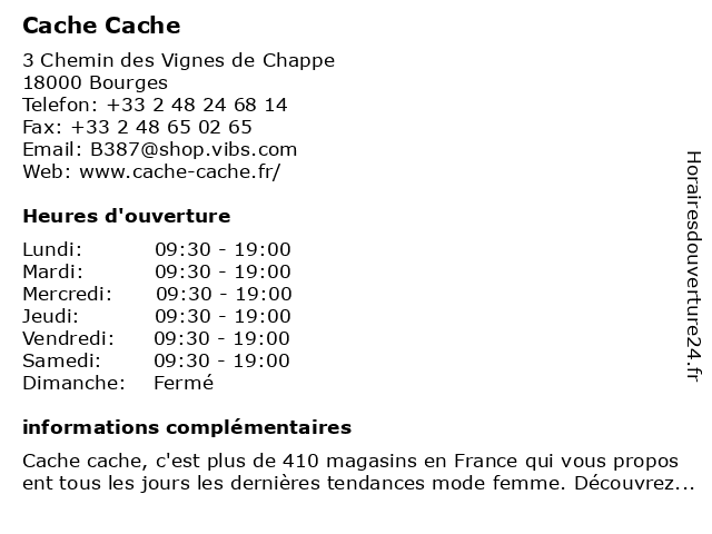 1 Cache Cache (Distance: 2,17 km) 6 Rue Pelvoysin, 18000 BOURGES accessoires, boutiques, cache, jean, jupe, pull, robe, soldes 2 Vib's (Cache Cache - Bonobo - Bréal) (Distance: 1,37 km) Route de la Charité, 18000 Bourges blazer femme, bonobo, boutique vêtement, bréal, cache, cardignan femme, chaussures femme, gilet femme, jean femme, jean homme, magasin vêtement, magasin vêtements mixte, manteau femme, manteau homme, mode femme, pull femme, pull homme, robe femme, sac femme, t-shirt femme, t-shirt homme, tailleur femme, top femme, vib's, vêtement femme, vêtement homme, vêtement mixte 3 Amplifon (Distance: 2,25 km) 83 Rue d'Auron, 18000 Bourges aides à la communication, amplifon, audition, auditives, cache-oreilles, centre, produits de nettoyage, protections auditives, prothèse auditive, solutions 4 Cache Cache (Distance: 41,49 km) 12 Rue Porte Mutin, 18200 Saint-Amand-Montrond blazer femme, boutique vêtement, cache, cache cache, cardignan femme, chaussures femme, gilet femme, jean femme, magasin vêtement, manteau femme, mode femme, pull femme, robe femme, sac femme, t-shirt femme, tailleur femme, top femme, vêtement femme 5 Vib's (Cache Cache - Bonobo - Bréal) (Distance: 49,49 km) Rue des Cordeliers, 58200 Cosne-Cours-sur-Loire blazer femme, bonobo, boutique vêtement, bréal, cache, cardignan femme, chaussures femme, gilet femme, jean femme, jean homme, magasin vêtement, magasin vêtements mixte, manteau femme, manteau homme, mode femme, pull femme, pull homme, robe femme, sac femme, t-shirt femme, t-shirt homme, tailleur femme, top femme, vib's, vêtement femme, vêtement homme, vêtement mixte 6 |