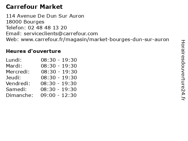 | 1 Carrefour Market (Distance: 3,00 km) 110 Avenue Marcel Haegelen, 18000 Bourges 24/24h, alimentaire, carrefour, market, service, station, supermarché 2 Carrefour Market (Distance: 3,83 km) 191 Les Terres du Fenestrelay, 18390 Saint-Germain-du-Puy carrefour, hard discount, hypermarchés, les dépanneurs, market, supermarchés 3 Carrefour Market (Distance: 3,93 km) - avenue du Maréchal de Lattre de Tassigny, 18000 Bourges alimentaire, alimentation, carrefour, courses, distributeur, hypermarché, market, supermarché, épicerie 4 Carrefour Market (Distance: 14,66 km) 2 Rue Jean Moulin, 18400 Saint-Florent-sur-Cher carrefour, hard discount, les dépanneurs, les hypermarchés, les supermarchés, market 5 Carrefour Market (Distance: 15,42 km) - Route de Paris, 18110 Saint-Martin-d'Auxigny alimentation, carrefour, magasin discount, market, supermarché 6 Carrefour Market (Distance: 17,86 km) - Avenue Jean Chatelet, 18500 Mehun-sur-Yèvre carrefour, hard discount, hypermarchés, les dépanneurs, market, supermarchés |