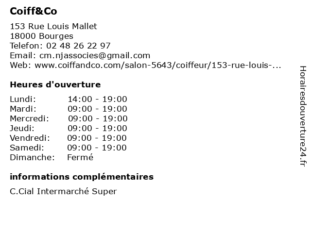 1 Coiff&Co (Distance: 11,96 km) n/a Route de la Charité, 18390 Saint Germain du Puy coiff&co, coiffeur, mixte, salon 2 Urban Coiff (Distance: 1,91 km) 124 Rue Auron, 18000 Bourges beauté, coiff, coiffure, coiffures, coloristes, urban 3 Magasin Coiff'Idis (Distance: 1,91 km) 10 Quai Messire Jacques, 18000 Bourges coiff'idis, coiffeur, magasin, salon 4 Columbus Café & Co (Distance: 2,35 km) - cours Avaricum, 18000 Bourges biscuits, café, co, columbus, goùter, gâteaux, muffin, pâtisserie, restaurant, viennoiserie 5 L'Coiff (Distance: 2,70 km) 16 Rue Félix Pyat, 18000 Bourges beauté, coiffure, coiffures, coloristes, l'coiff 6 Coiff & Moi (Distance: 3,89 km) 5bis route de Marmagne, 18570 La Chapelle-Saint-Ursin balayage, coiff, coiffeur, coiffure, coloration, coupe, moi, mèches |