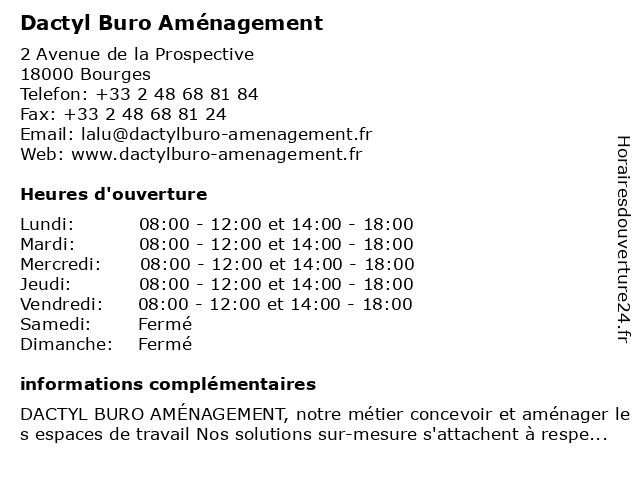 1 Dactyl Buro Du Centre (Distance: 0,01 km) 2 Avenue de la Prospective, 18021 Bourges bureau, buro, centre, dactyl, du, matériel 2 Dactyl Buro Office (Distance: 4,04 km) 15 Rue des Arènes, 18000 Bourges bureau, buro, dactyl, fournitures, office 4 Direction régionale de l'environnement, de l'aménagement et du logement (DREAL) (Distance: 4,69 km) 6 place de la Pyrotechnie, 18000 Bourges administration, agence, ars, cher, de, direction, dreal, du, délégation, départementale, et, l'aménagement, l'environnement, logement, organismes, publics, régionale, santé, services 5 Desjardins Aménagement Extérieur (Distance: 12,39 km) Saint-Aubin, 18500 Marmagne aménagement, desjardins, extérieur 6 Buro Typ - Calipage (Distance: 36,49 km) 49 route de Bourges, 36103 Issoudun buro, calipage, informatique, loisirs récréatif, mobilier, papier, typ |