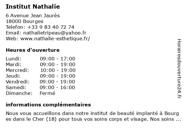 2 Institut Renais&Sens (Distance: 0,50 km) 1 rue de l'Ile d'Or - 3ème étage, 18000 Bourges beauté, corps, dépilation, institut, mains, pieds, renais, renais&sens, sens, visage 5 Milena Institut - Institut de beauté (Distance: 2,07 km) 115 Rue Amedée Bollée, 18230 Saint-Doulchard beauté, de, institut, manucure, milena, pédicure, saint-doulchard, salon 6 Naturel Beauté Institut (Distance: 2,56 km) - Rue Raymond Boisdé, 18000 Bourges beauté, institut, manucure, massage, naturel, soins, épilation |