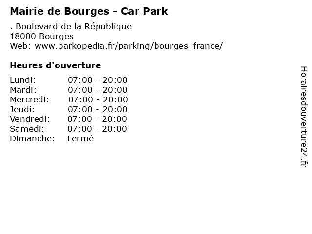 1 Mairie de Bourges - Car Park (Distance: 0,29 km) . Place George Sand, 18000 Bourges automobile, bourges, car, de, mairie, park, parking, services 2 Mairie de Bourges - Car Park (Distance: 0,32 km) . Rue Édouard Branly, 18000 Bourges automobile, bourges, car, de, mairie, park, parking, services 3 Mairie de Bourges - Car Park (Distance: 0,36 km) . Rue Jacques Coeur, 18000 Bourges automobile, bourges, car, de, mairie, park, parking, services 4 Mairie de Bourges - Car Park (Distance: 0,41 km) . Rue des Arènes, 18000 Bourges automobile, bourges, car, de, mairie, park, parking, services 5 Mairie de Bourges - Car Park (Distance: 0,44 km) . Cours Anatole France, 18000 Bourges automobile, bourges, car, de, mairie, park, parking, services 6 Mairie de Bourges - Car Park (Distance: 0,44 km) . Rue Gambon, 18000 Bourges automobile, bourges, car, de, mairie, park, parking, services |