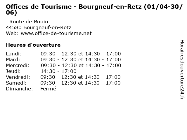 Termes de recherche pour Offices de Tourisme - Bourgneuf-en-Retz (01/04-30/06):en, de, services, tourisme, bureaux, retz, 30/06, bourgneuf, 01/04, offices |