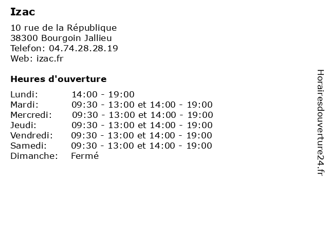 1 Izac (Distance: 0,00 km) 10 rue de la République, 38300 Bourgoin Jallieu accessoires pour hommes, izac, prêt à porter, vêtements 2 IZAC (Distance: 10,00 km) 1 Parc du Couvent, 38090 Villefontaine accessoires, izac, magasin, mode, prêt à porter, vêtements 3 IZAC (Distance: 34,58 km) 2 rue Voltaire, 38500 Voiron accessoires, izac, magasin, mode, prêt à porter, vêtements 5 Izac (Distance: 39,59 km) 112 cours Charlemagne, 69002 Lyon chaussures, izac, lingerie, mode enfant, mode femmes, mode hemmes, sport 6 IZAC (Distance: 44,50 km) - Chemin Jean-Marie Vianney, 69130 Ecully accessoires, izac, magasin, mode, prêt à porter, vêtements |