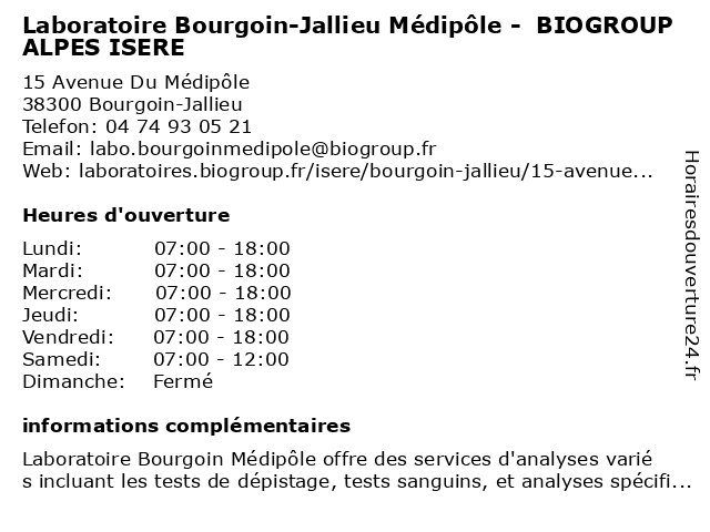 1 Laboratoire de biologie médicale Oriade Noviale (Distance: 0,00 km) 15 Avenue du Médipôle, 38300 Bourgoin-Jallieu biologie, de, laboratoire, médicale, noviale, oriade 2 CH Pierre Oudot - Laboratoire d'analyses (Distance: 0,07 km) 30 Avenue du Médipôle, 38302 Bourgoin-Jallieu bureau, ch, consultation, d'analyses, dr, laboratoire, maladie, med, médecin, médecine, oudot, pierre, pratique, thérapie, traitement 3 Médipôle - Cabinet d'ophtalmologie - Ophtalmologie (secrétariat ) (Distance: 0,25 km) 60 Avenue du médipôle, 38300 Bourgoin Jallieu cabinet, consultation, d'ophtalmologie, docteur, médipôle, ophtalmologie, santé, secrétariat 4 PARC ACIER PROLIANS RHÔNE-ALPES AUVERGNE Bourgoin-Jallieu (Distance: 0,68 km) 7 Rue Louis Braille, 38300 Bourgoin-Jallieu acier, alpes, auvergne, bourgoin, jallieu, parc, prolians, rhône 5 PROLIANS RHÔNE-ALPES AUVERGNE Bourgoin-Jallieu (Distance: 0,68 km) 7 Rue Louis Braille, 38300 Bourgoin-Jallieu alpes, auvergne, bourgoin, jallieu, prolians, rhône 6 Alpes Isère Habitat (Distance: 2,54 km) 1 Rue de la Berjallière, 38300 Bourgoin-Jallieu agence, alpes, appartement, habitat, immobilier, isère, locations, maison, vente |