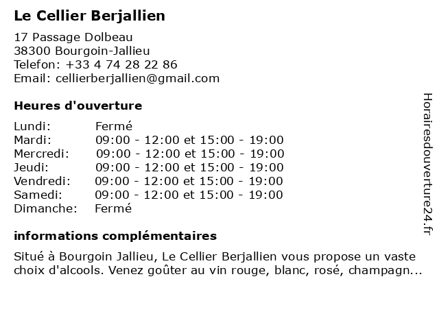 1 Allo Taxi Berjallien (Distance: 0,48 km) 39 Rue de la Libération, 38300 Bourgoin-Jallieu allo, berjallien, taxi 2 L'endroit Berjallien (Distance: 1,14 km) 2 Rue Joseph Cugnot, 38300 Bourgoin-Jallieu bar, berjallien, brasserie, l'endroit, restaurant 3 Allo Taxi Berjallien (Distance: 7,49 km) 27 Allée René Caillie, 38090 Villefontaine allo, berjallien, taxi 4 Nespresso (Le cellier Gourmand) (Distance: 13,64 km) 2 Rue des Muguets, 38070 Saint-Quentin-Fallavier accessories, cellier, coffee, gourmand, le, machines, nespresso, points de recyclage, services 5 Domaine Demeure Pinet - Le Cellier de Joudin (Distance: 29,37 km) 1275 Route de Joudin, 73240 Saint-Genix-sur-Guiers cellier, de, demeure, domaine, joudin, le, pinet, récoltants, viticulteurs 6 Le Cellier des 3 Pierres (Distance: 38,28 km) . Rond-Point Jean Monnet, 01300 Belley alcool, cave, caviste, cellier, champagne, des, le, pierres, spiritueux, vins, épicerie |